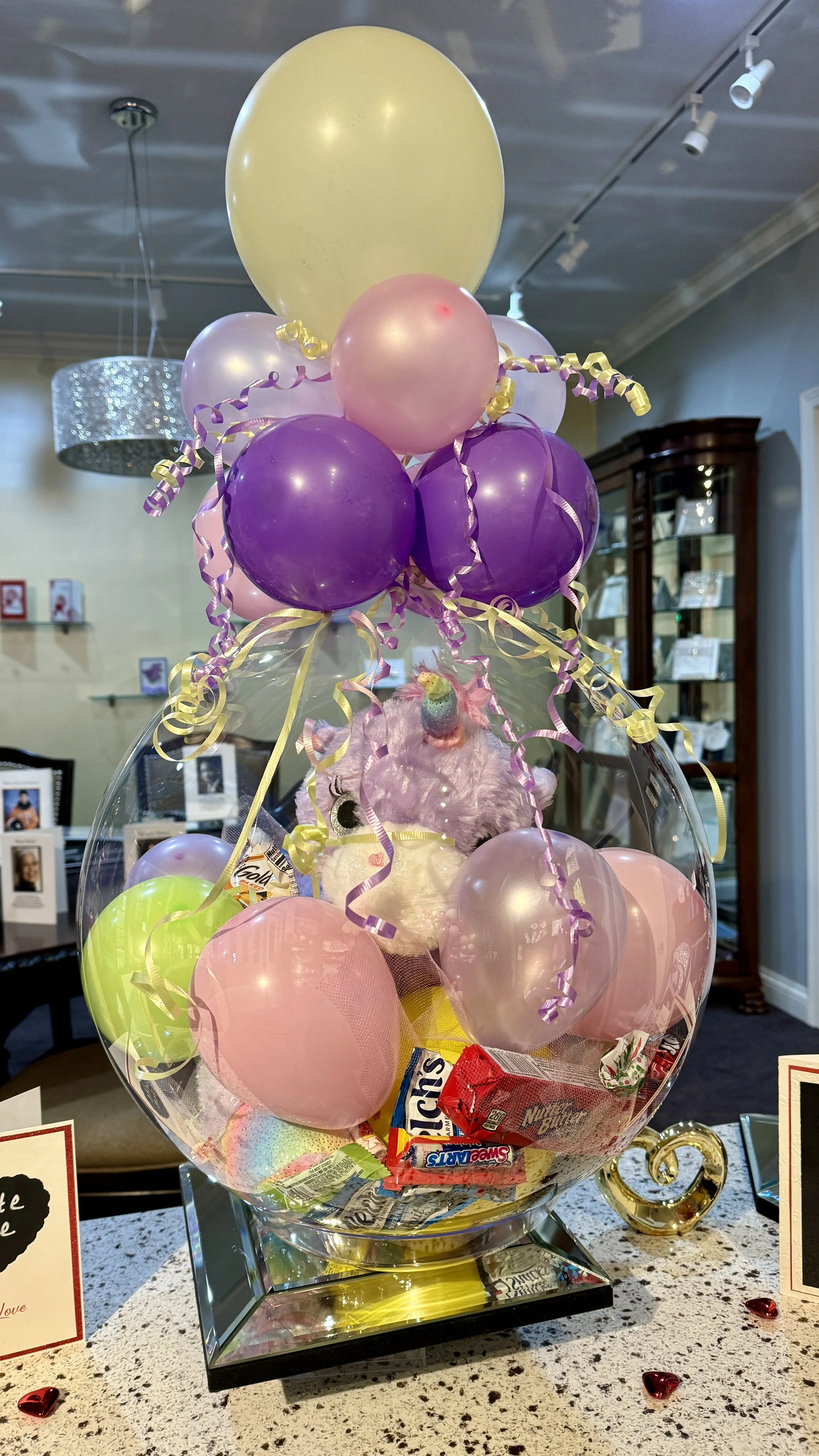 FINICKY features KEEPSAKES IN A BALLOON! Now, you can present your favorite chocolates, stuffed animals, candies, teddy bears, money, baby reveal, soft jewelry, or other soft-edged keepsakes to your family, friends, co-workers, or loved ones, inside a balloon.